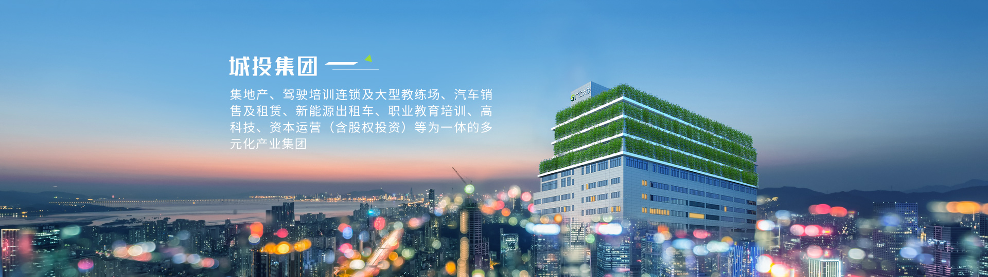 城投集團堅持“愛黨愛國、孝敬父母”的核心企業文化,主要業務為高科技、互聯網、基金投資、地產開發、職業教育培訓、駕駛培訓、汽車銷售及租賃、出租車運營等。